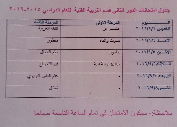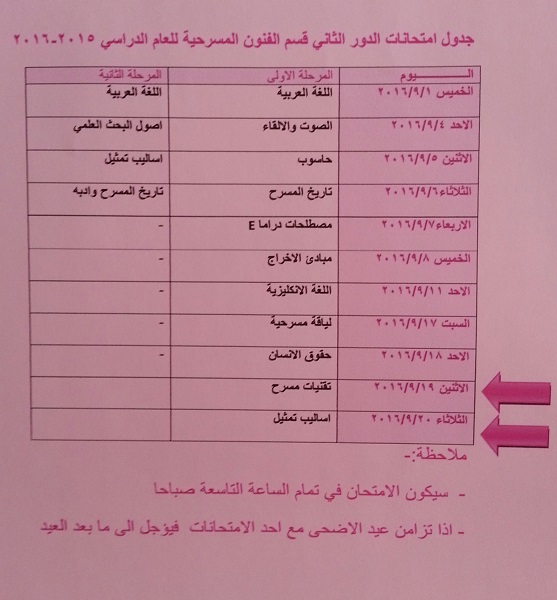 تنويه الى طلبة كلية الفنون الجميلة قسم الفنون المسرحية بانه تم اجراء تعديل على جدول امتحانات الدور الثاني وكما مبين في ادناه