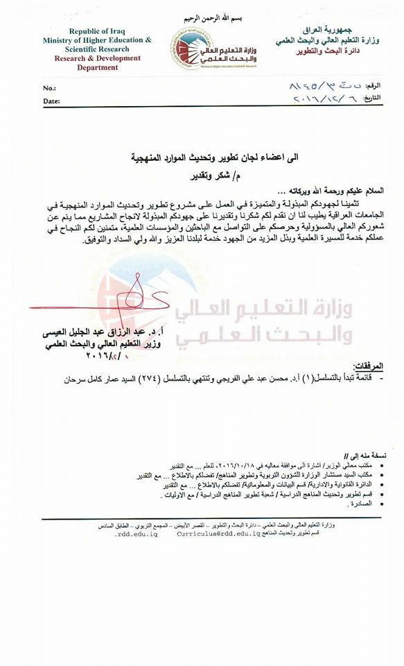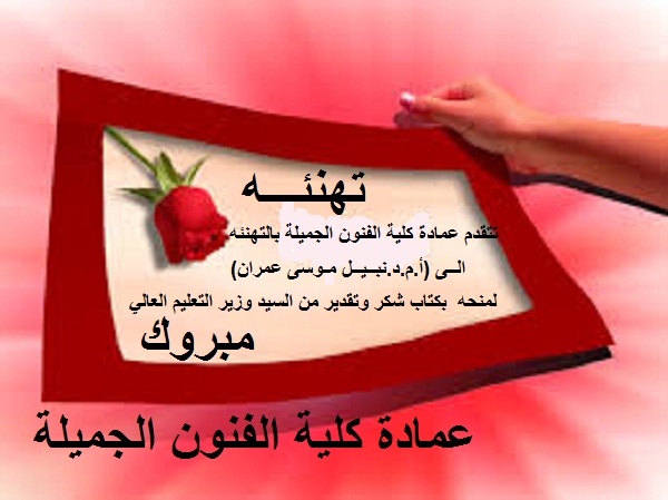 تهنئه الى (أ.م.د. نبيل موسى عمران) رئيس قسم التربية الفنية بمناسبة منحه كتاب شكر وتقدير من السيد وزير التعليم العالي والبحث العلمي