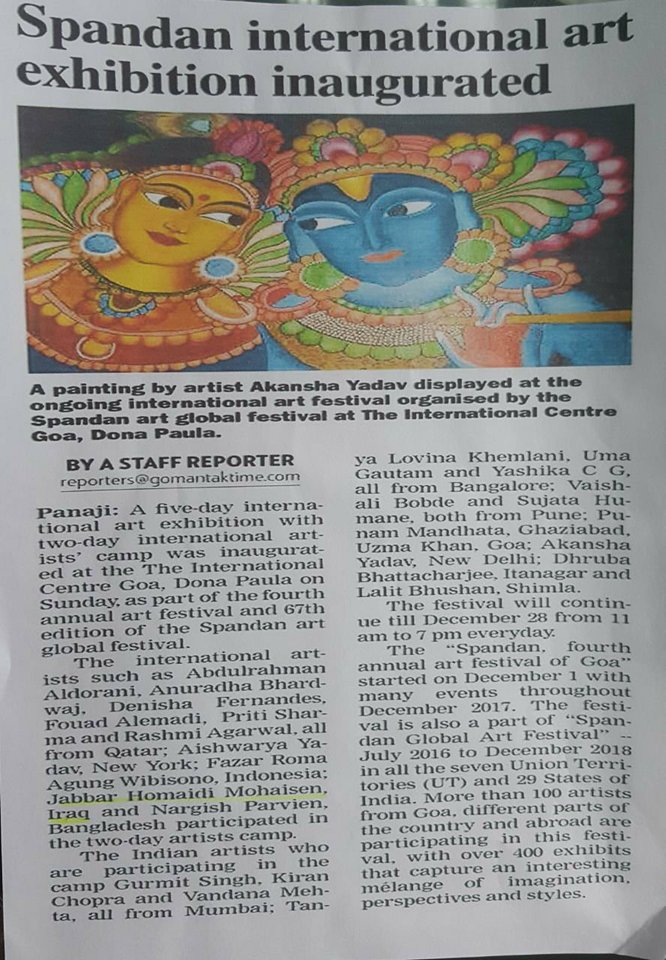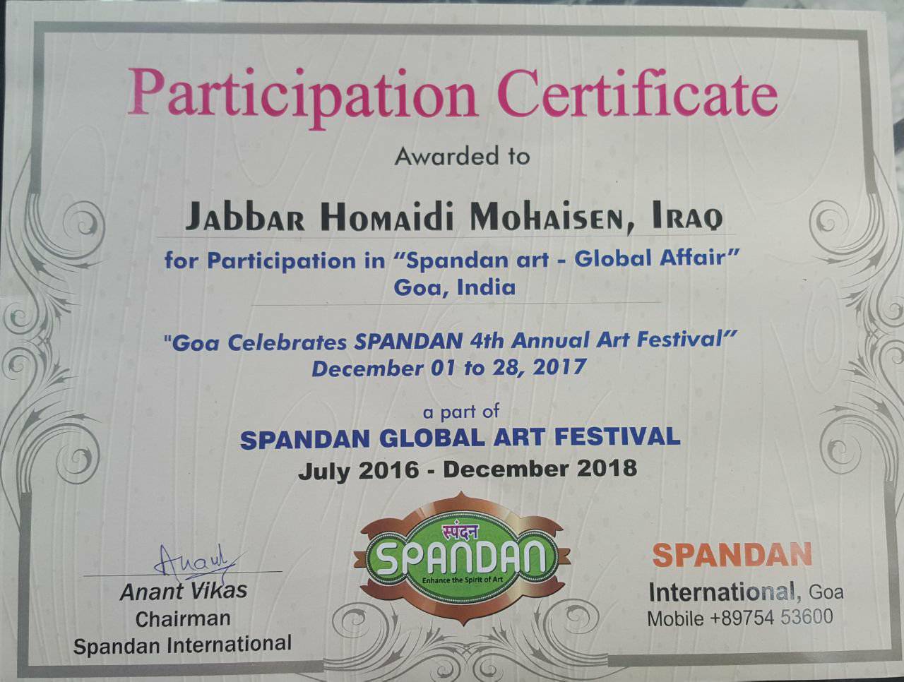 بدعوة من إدارة المعرض الدولي للرسم (سباندا) وبالتحديد في جزيرة (غوا) الهندية ، كان الدكتور جبار حميدي التدريسي في كلية الفنون الجميلة /قسم التربية الفنية موفدا الى هناك ، حيث تمت مشاركته وعرض لوحاته الفنية على قاعات المركز العالمي في جزيرة (غوا)، وبهذه المشاركة يكون الدكتور جبار حميدي ممثلا عن جامعة القادسية / كلية الفنون الجميلة ، وقد كان لمشاركته هذه أهمية بالغة في الحضور والمشاركة في مثل هكذا محفل عالمي وكذلك حضور اسم جامعة القادسية العريقة والسباقة في التمثيل الدولي وعلى مستويات عالمية ، وجدير بالذكر ان الدكتور حميدي قد حصل على شهادة مشاركة وكتاب شكر لدوره الفاعل في اداءه التشكيلي والفني من خلال لوحاته الفنية.
