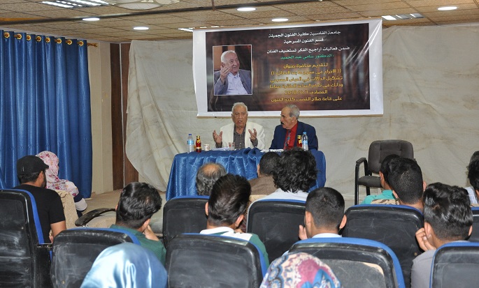 ورحب عميد الكلية بالضيف ، وحث الطلبة على الاستفادة من خبرته ومشواره الحافل بالمنجزات. ، وقد قدم الدكتور سامي عبد الحميد مجموعة من القواعد الاساسية التي تؤهل الطلبة على العمل على المسرح والاخراج وتحدث عن تجربته وعمله في مجال التمثيل والمسرح ومشواره المهني ومحطات عمله ، وقدم العديد من النصائح القيمة للطلبة ، والتي كانت ذات أهمية كبيرة ، وطرح الطلبة العديد من الاسئلة التي اجابة عليها الضيف ،واختتمت المحاضرة بكلمة من الدكتور كاظم نوير الزبيدي عميد الكلية الذي أعرب بها عن سعادته الغامرة بتلك الزيارة والمحاضرة القيمة متقدم بالشكر والتقدير للفنان الدكتور سامي عبد الحميد على حضوره ، مؤكد على استمرارية العمل بالخطة التي اعدتها الكلية والاقسام العلمية ، باستضافة المزيد من الشخصيات الاكاديمية والاعلامية المتخصصة في مجال الفنون المختلفة لإضافة الخبرات العلمية والعملية للطلبة ، ولتهيئتهم واعدادهم للدخول في فضاء العمل الفني الواسع. وقد ادار الحوار الدكتور باسم الاعسم . وجدير بالذكر ان الفنان سامي عبد الحميد احد أعمدة المسرح العراقي ورواده. قدم عبر مسيرته الفنية الطويلة أعمالا مسرحية متميزة، فضلا عن عشرات الأعمال السينمائية والإذاعية والتلفزيونية. بدأ اهتمام سامي عبد الحميد (مواليد السماوة عام 1928) بالتمثيل وهو في مرحلة مبكرة من حياته، وتحديدا عندما كان في ثانوية الديوانية، حيث شارك في تمثيل مسرحيتي: البخيل، وفي سبيل التاج. وبحكم عمل والده في احدى الدوائر الحكومية انتقل وعائلته الى بغداد، حيث التحق بكلية الحقوق، والتقى خلالها صديقه الفنان يوسف العاني، الذي كان يترأس حينذاك فرقة (جبر الخواطر) المسرحية، وقدم مع زميل له مسرحية “تاجر البندقية” أخراج الفنان الراحل ابراهيم جلال، الذي شجع سامي عبد الحميد على دراسة التمثيل.