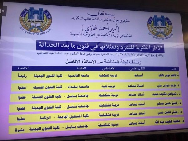 من باب التعاون العلمي والتواصل بين الجامعات العراقية لتبادل الأفكار والرؤى ترأس السيد عميد كلية الفنون الجميلة جامعة القادسية الاستاذ الدكتور كاظم نوير كاظم لجنة مناقشة أطروحة الدكتوراه الموسومة (الاطر الفكرية للتمرد وتمثلاتها في فنون ما بعد الحداثة) للطالب امير احمد غازي وذلك يوم الأبعاء الموافق 26 / 9 / 2018 في جامعة بابل / كلية الفنون الجميلة وكانت الدراسة تتقصى تمثلات فنون ما بعد الحداثة وسماتها وخصائصها الفنية والجمالية في التجارب الفنية وقد أشادت لجنة المناقشة بالأطروحة التي قدمها الباحث وبقدرات الباحث العلمية والبحثية .