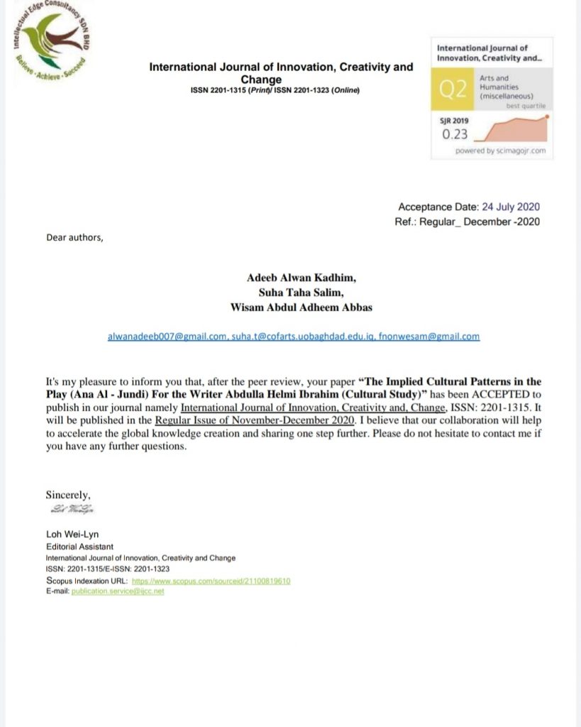 نشر التدريسي في كلية الفنون الجميلة في جامعة القادسية ألاستاذ المساعد الدكتور اديب علوان بحثا علميا مشتركا بعنوان