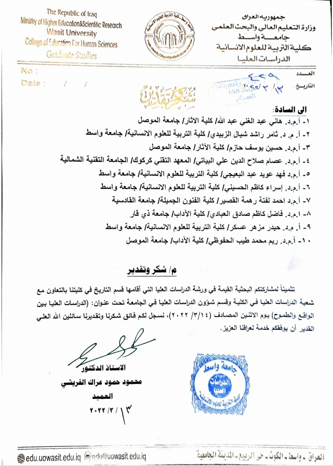 وعلى هامش الورشة تم تكريم التدريسي بكتاب شكر وتقدير لمشاركته العلمية من قبل السيد عميد كلية التربية للعلوم الانسانية جامعة واسط .