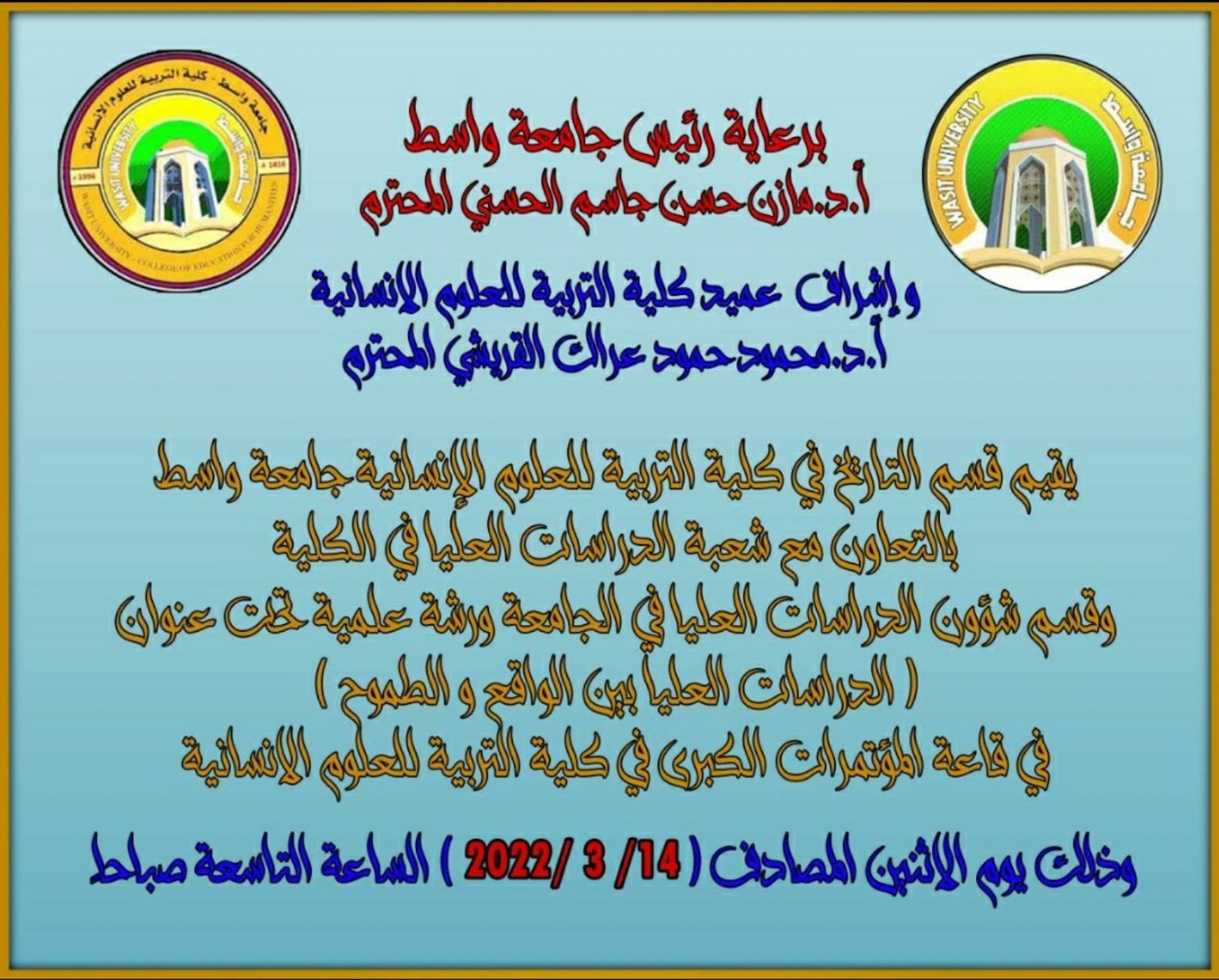 شارك التدريسي في كلية الفنون الجميلة الاستاذ المساعد الدكتور احمد لفته رهمة القصير في الورشة العلمية التي اقامتها كلية التربية للعلوم الانسانية في جامعة واسط وبالتعاون مع شعبة الدراسات العليا والبحث والتطوير في الجامعة والوزارة تحت عنوان (الدراسات العليا بين الواقع والطموح) في قاعة المؤتمرات الكبرى في الكلية في يوم الاثنين الموافق 2022/3/14 وبمشاركة نخبة من اساتذة الكليات في الجامعات والمعاهد العراقية ووزارة التربية لمناقشة ودراسة واقع الدراسات العليا في الجامعات العراقية